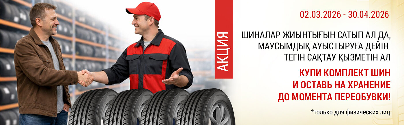 НАУҚАН! Жеңіл автокөлікке арналған жазғы шиналардың (кез келген брендтің) жиынтығын (4 дана) сатып алған кезде, шиномонтаж қызметіне дейін маусымдық сақтау тегін ұсынылады.